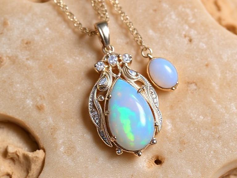 Opalite—an opal-inspired crystal—is widely used in affordable opal jewelry collections due to its rainbow glow and lightweight feel.