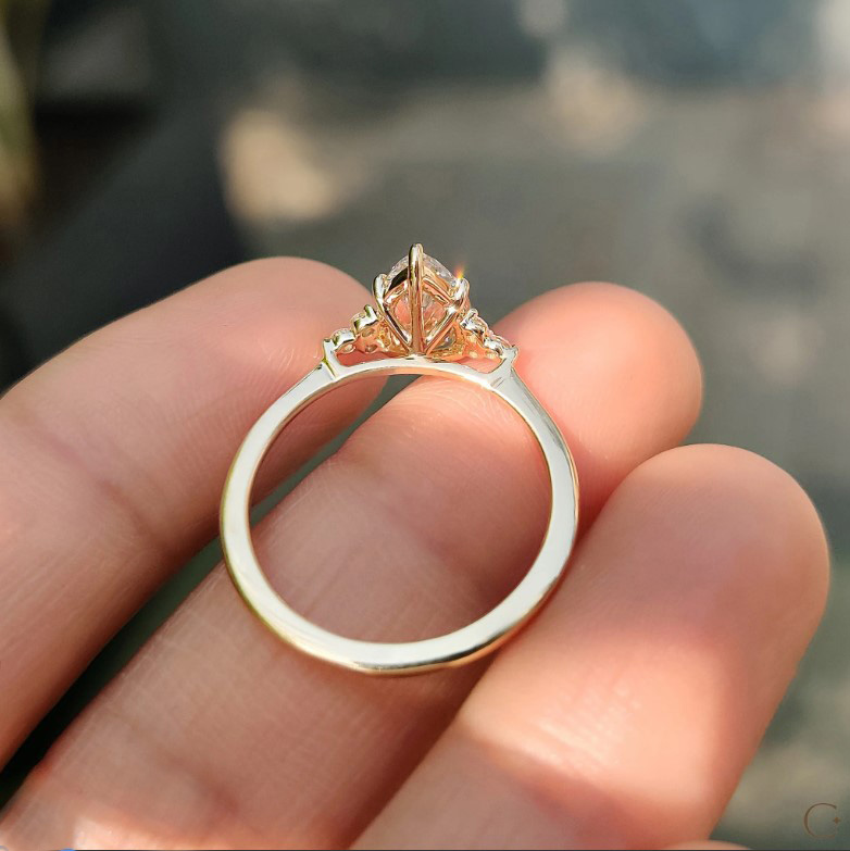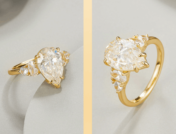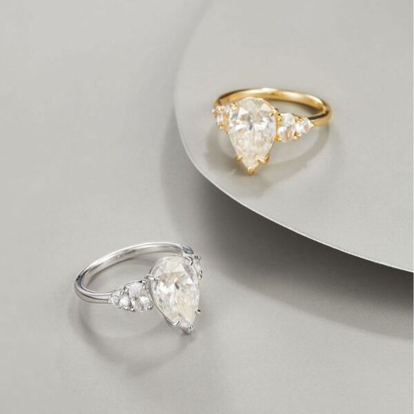 This Pear Cut Engagement Ring uses a timeless twist to capture the elegance of modern design. Showing a stunning pear-shaped moissanite ring with round side stones, it glitz. While the claw prong setting keeps the main diamond safe, the yellow gold moissanite ring setting accentuates its warm, rich tone.