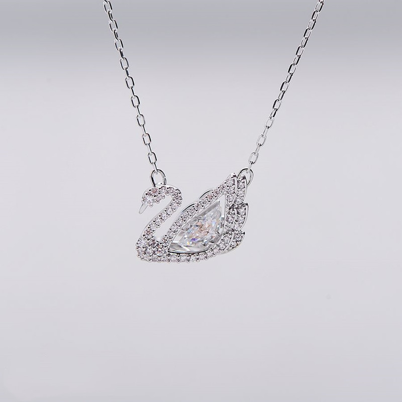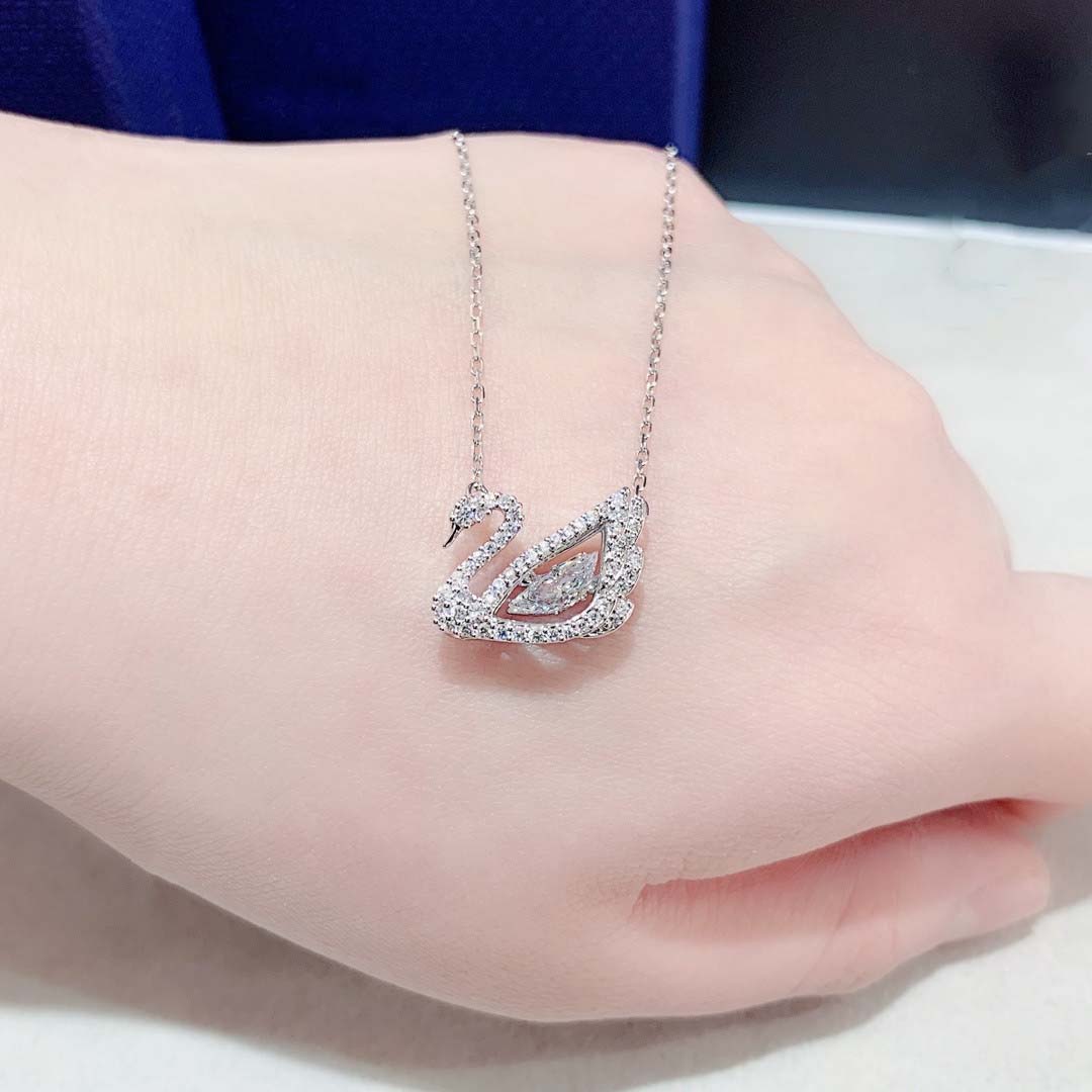 The heart of our collection, this exquisite necklace features the iconic swan motif, brought to life with brilliant, precision-cut crystals. The swan’s form is delicately outlined in sparkling pavé stones, cradling a magnificent, pear-cut “dancing” crystal at its center that catches the light with your every movement. Suspended from a delicate chain, it rests beautifully on the collarbone, offering a touch of understated glamour.