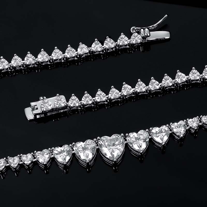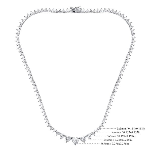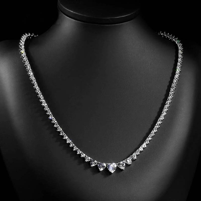Indulge in timeless romance with our Eternal Hearts Graduated Necklace, a captivating piece designed to sparkle with every movement. This exquisite necklace features a stunning array of heart-shaped cubic zirconia stones, meticulously graduated from delicate smaller hearts along the chain to larger, interlocking double hearts at the center—symbolizing unbreakable love and connection. Set in high-polish sterling silver with a rhodium plating for enhanced durability and brilliance, it offers a luxurious, hypoallergenic finish that’s comfortable for all-day wear.