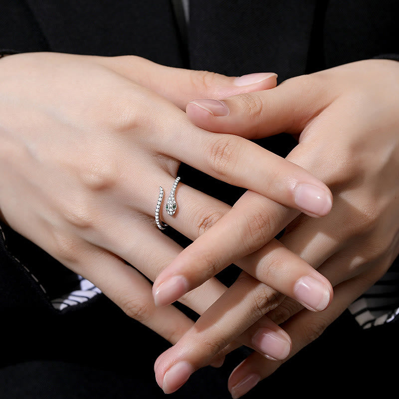 Silver Snake Protection Ring features 925 sterling silver with an adjustable open design, showcasing a captivating green-eyed snake motif. This ring symbolizes transformation and protection, making it a meaningful piece. The intricate snake detail embodies renewal and resilience, while its adjustable fit ensures comfort and flexibility. This ring serves as a powerful reminder of inner strength and balance.💕