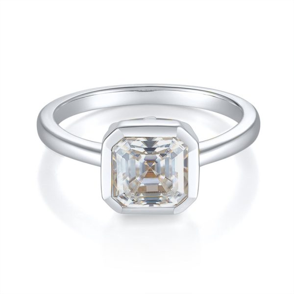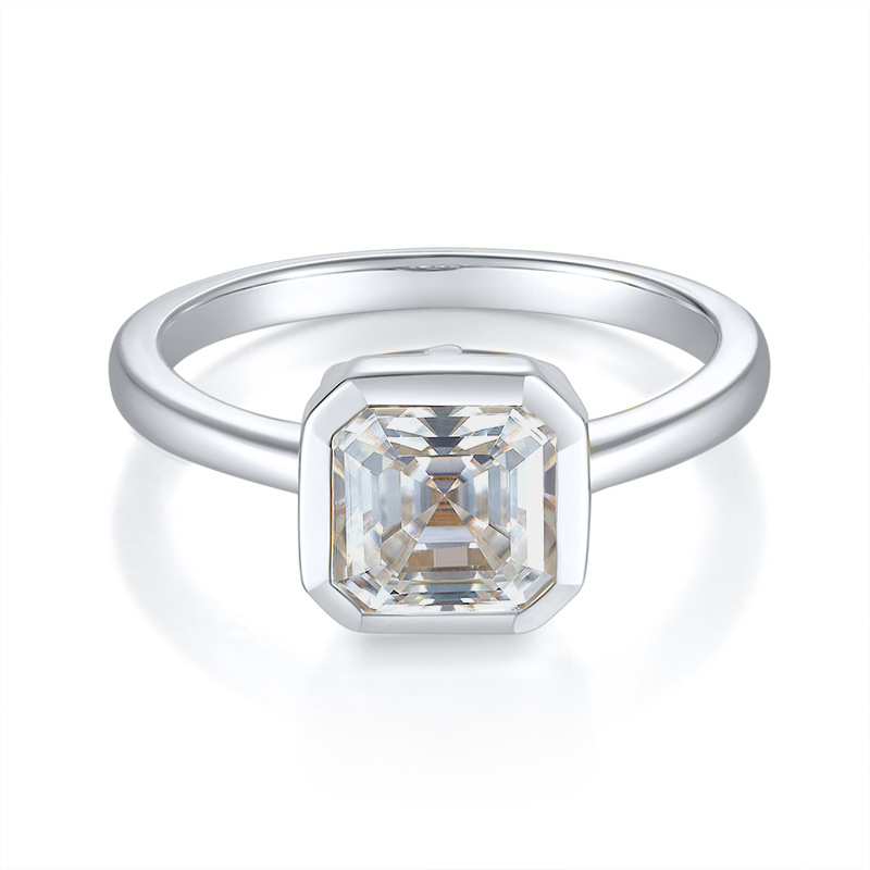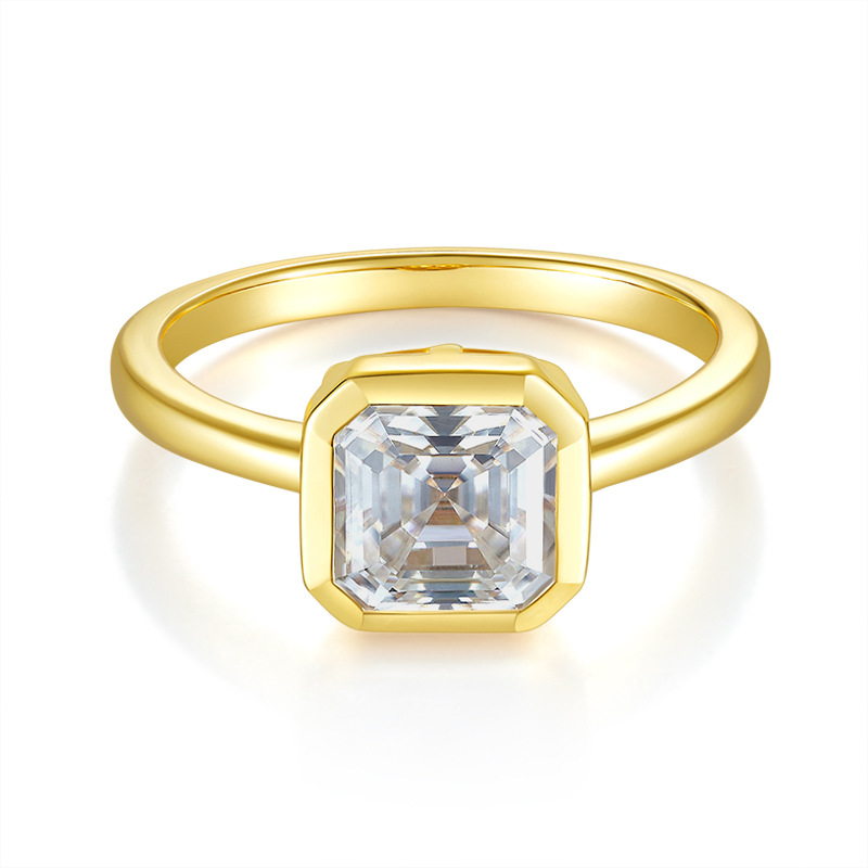 Each Asscher Cut Engagement Ring uses high quality moissanite to capture attention with every movement. The semi bezel setting adds a touch of strength without hiding the beauty. The soft glow of the light yellow Asscher cut Moissanite adds warmth and charm.