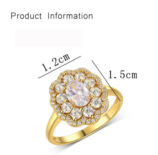At its heart, a brilliant oval-cut moissanite (D-color, VVS clarity) takes center stage, surrounded by a lush “floral halo” of tiny round moissanite accents. The golden setting amplifies the gemstones’ fire, catching light with every movement for that head-turning glow you crave.