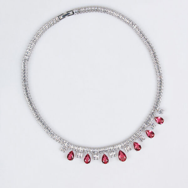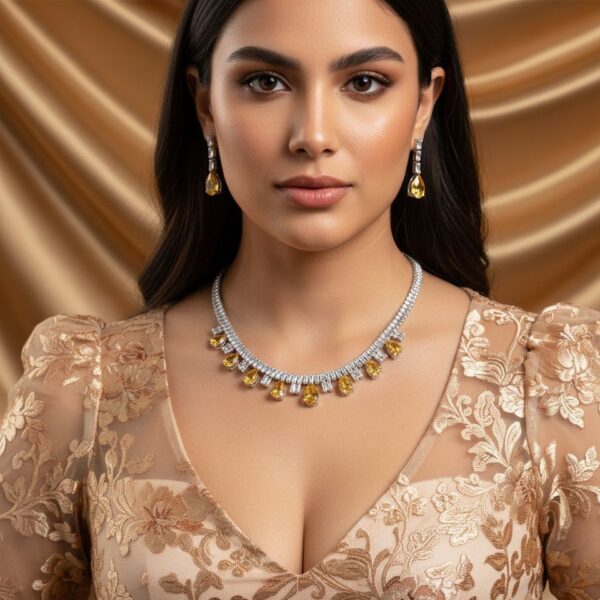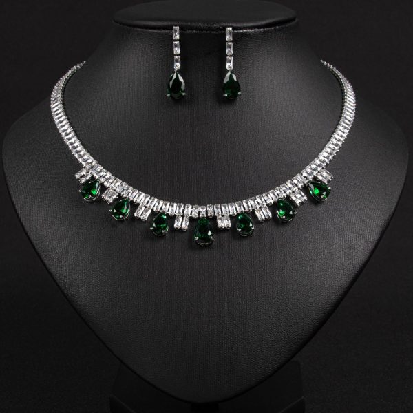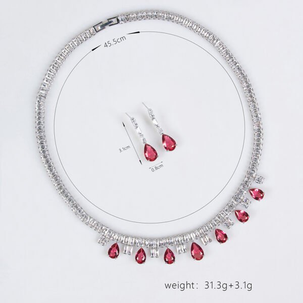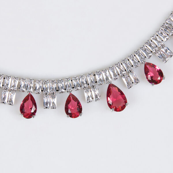Design Highlights: The necklace adopts a chic choker silhouette, with the main chain densely set in square zirconia stones. Multiple teardrop-shaped stones (including one large central teardrop zirconia) cascade from the lower edge. Paired with matching teardrop earrings, the ensemble creates a soft, curved silhouette. It preserves the refined essence of vintage jewelry while accentuating the graceful lines of the neck and shoulders through fluid contours.
