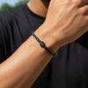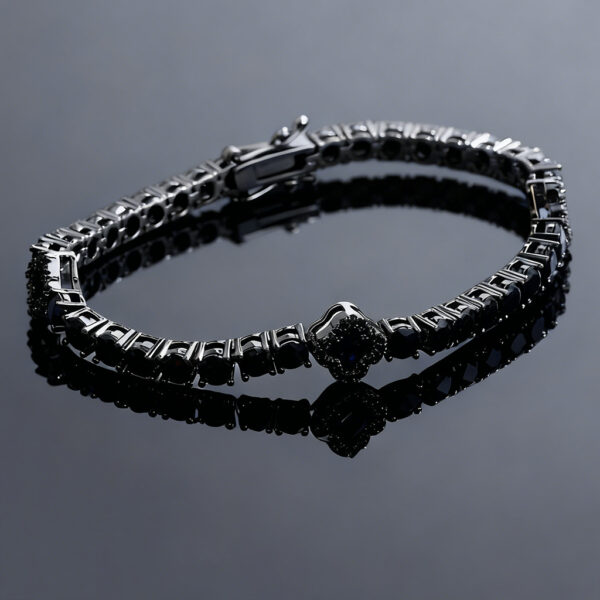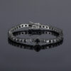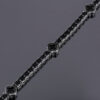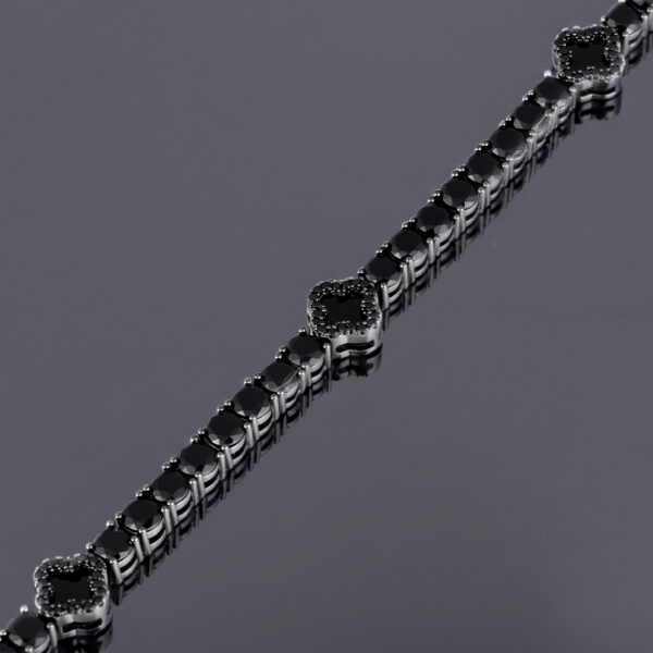 • This stylish and elegant bracelet features a simple, dark design with a polished metal chain set with faceted black gemstones. A four-leaf clover motif at the center, surrounded by a cluster of pavé gemstones, adds a touch of sophistication and understated sparkle, making it suitable for both formal and casual occasions.