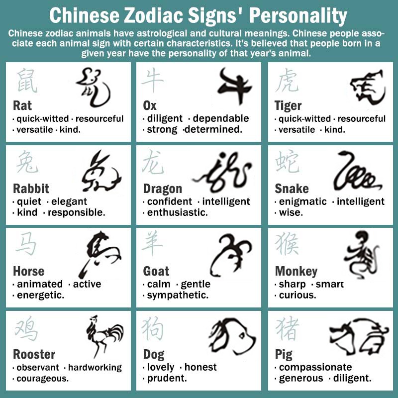 Chinese zodiac animals have astrological and cultural meanings. Chinese people associate each animal sign with certain characteristics. It’s believed that people born in a given year have the personality of that year’s animal.