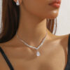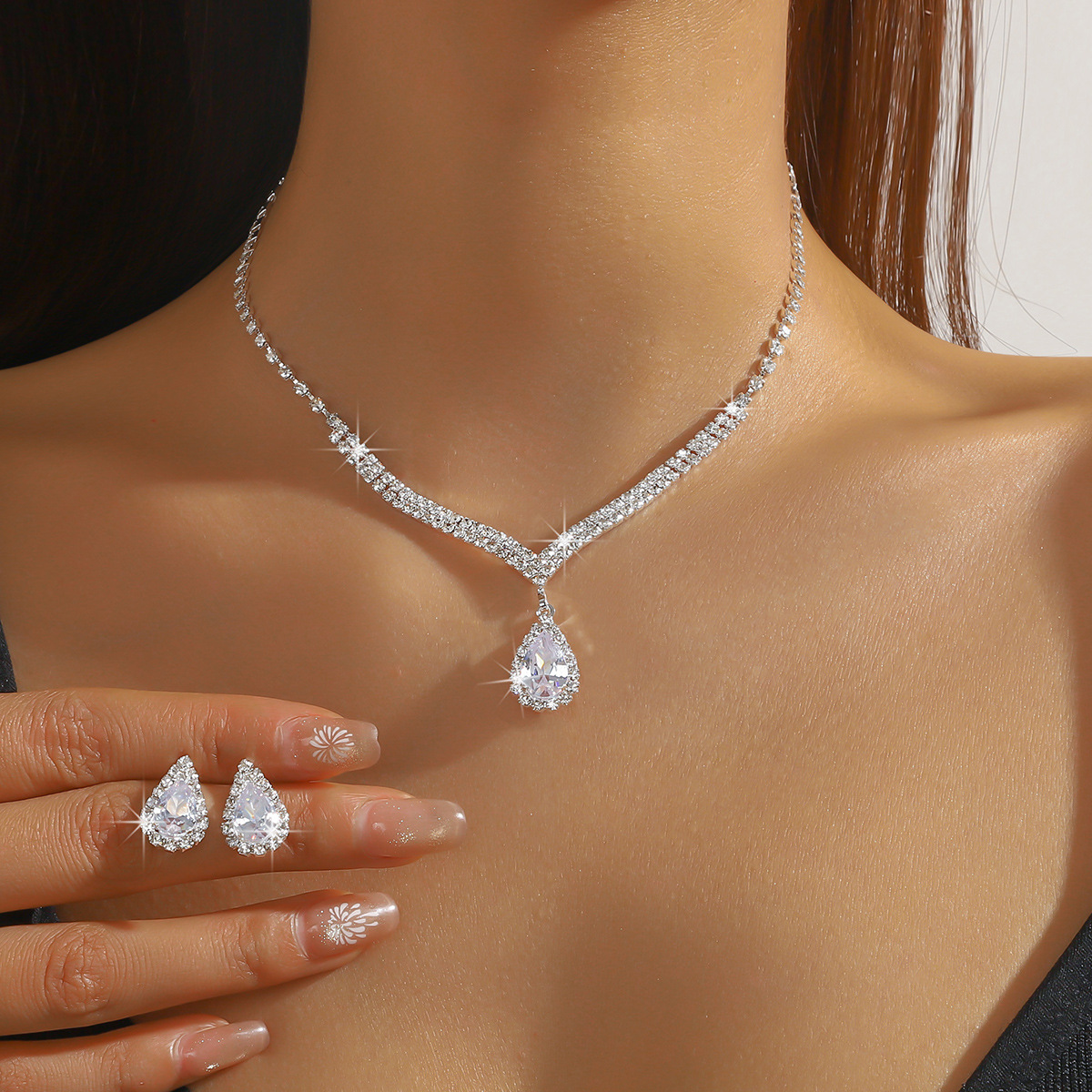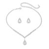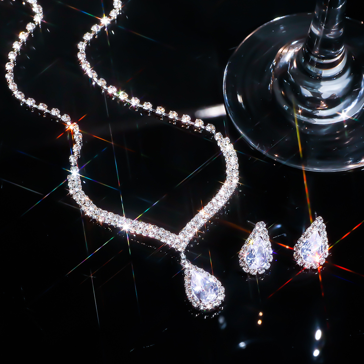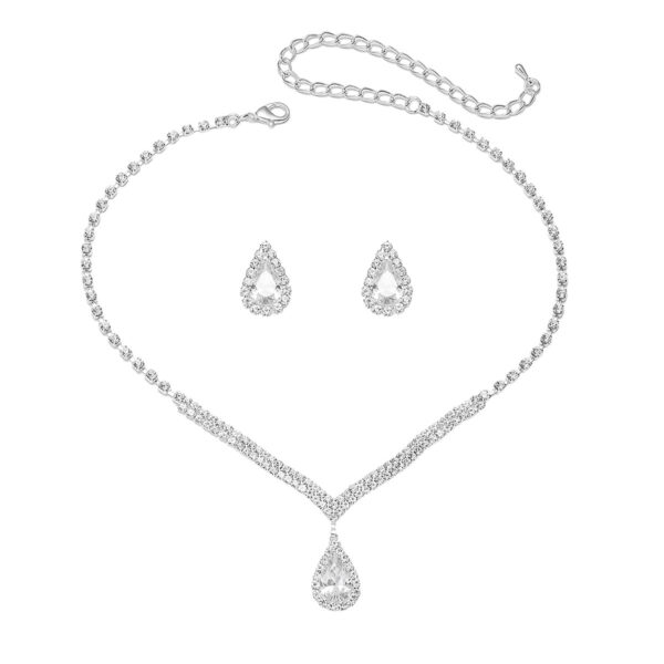 • This jewelry set shines with luxurious design. Sparkling diamond-like zirconias surround it. The teardrop necklace ends in a stunning central pendant, paired with matching earrings. Meticulously crafted, it blends elegance and charm. Ideal for formal/special occasions, adding luxury to any outfit.