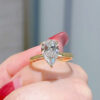 This Pear Cut Engagement Ring uses a timeless twist to capture the elegance of modern design. Showing a stunning pear-shaped moissanite ring with round side stones, it glitz. While the claw prong setting keeps the main diamond safe, the yellow gold diamond ring setting accentuates its warm, rich tone.
