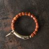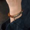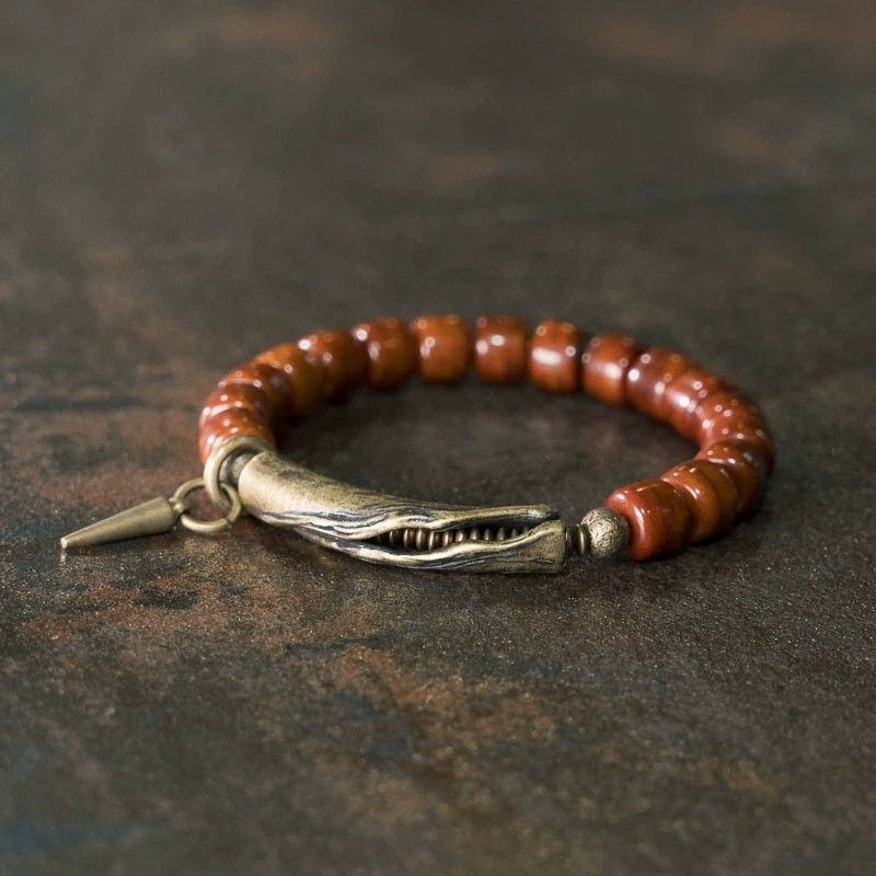 This men’s bracelet features a unique design that blends rustic charm with artistic details.  The focal point is a distinctive metallic component shaped like a stylized whale or a similar creature, with intricate engravings and a pointed charm attached, adding an edgy and adventurous vibe. The combination of the earthy beads and the metallic accent creates a harmonious balance between nature-inspired elements and bold craftsmanship, making it a standout accessory for men who appreciate unconventional and stylish jewelry. It’s perfect for adding a touch of personality to both casual and slightly rugged outfits.