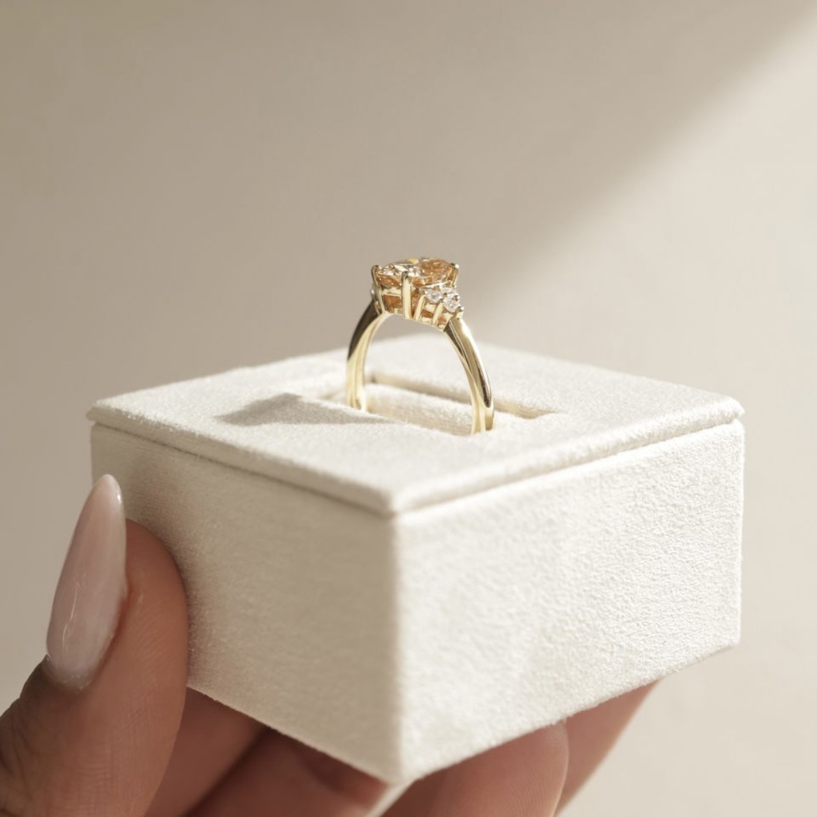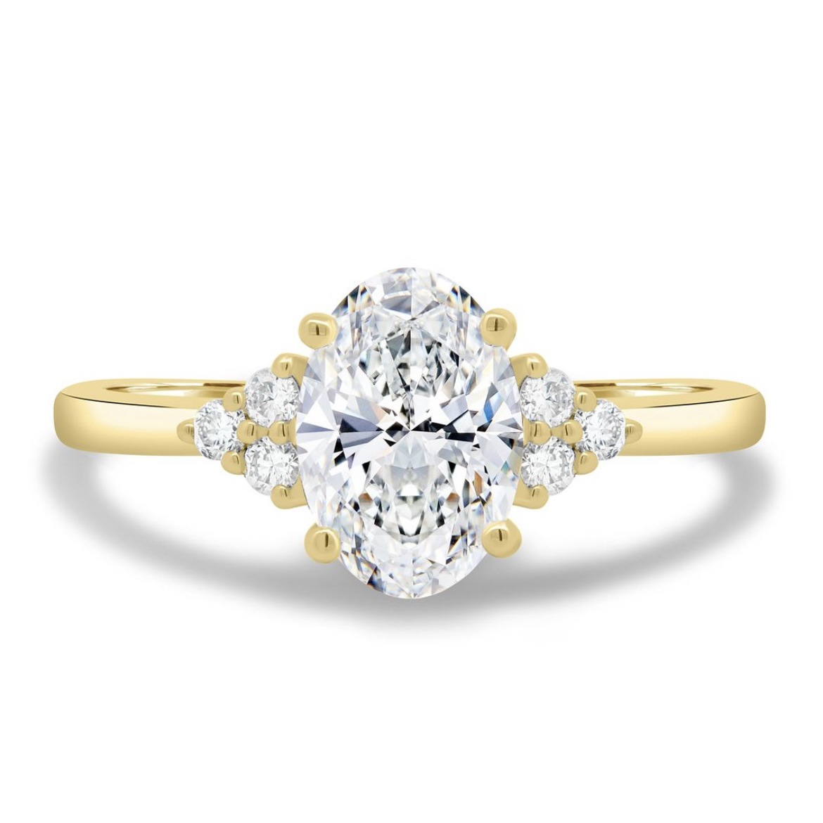 This Oval Shaped Moissanite Engagement Ring is a really beautiful work combining classic elegance with contemporary style. Set in a muse environment with a prong setting engagement ring style,Β  while the round side stone ring adds further sparkle, the tapered shank accentuates the elegance of the ring. Ideal for everyone searching for a distinctive personal touch engagement ring.