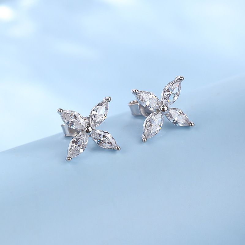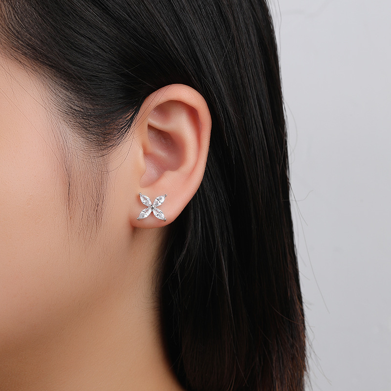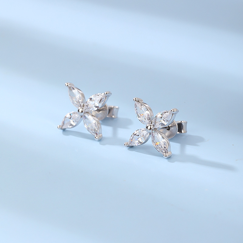 Laotlon Flower Stud Marquise Cut Diamond Earrings In White Gold