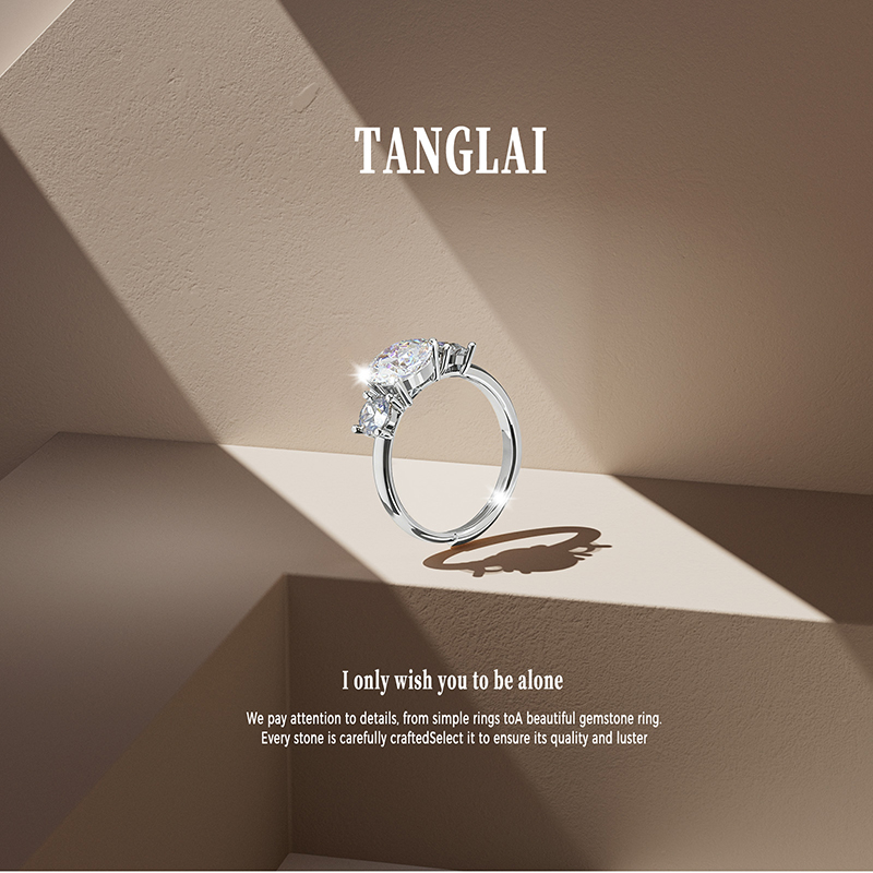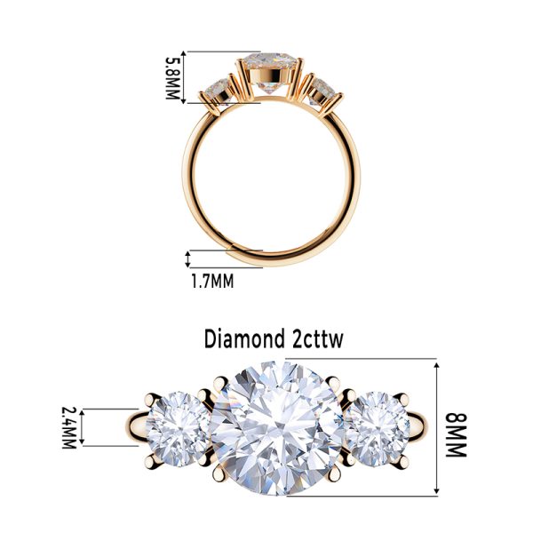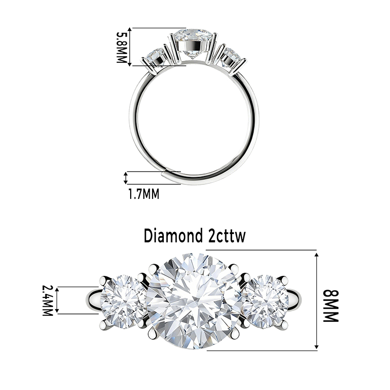 • Center stones: 2 round moissanite stones, 2.4×2.4 mm each; 1 round moissanite stone, 8×8 mm (2 carats)