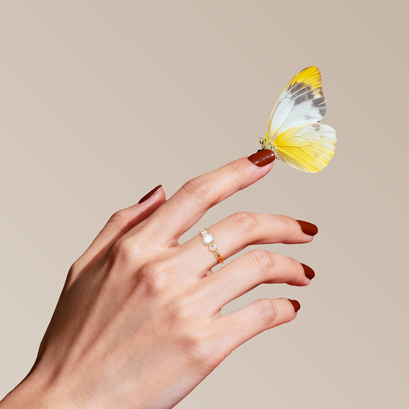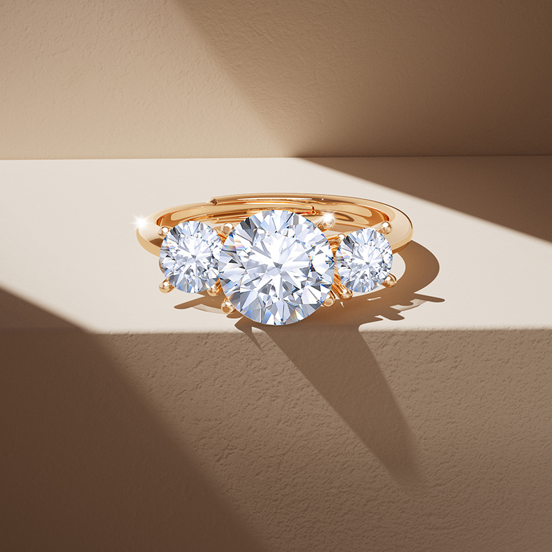 3 Stone Round Engagement Ring features a balanced trio of Round Cut Moissanite stones set in warm Yellow Gold engagement ring metal. The clean and structured Cathedral Setting adds height and definition to the design.