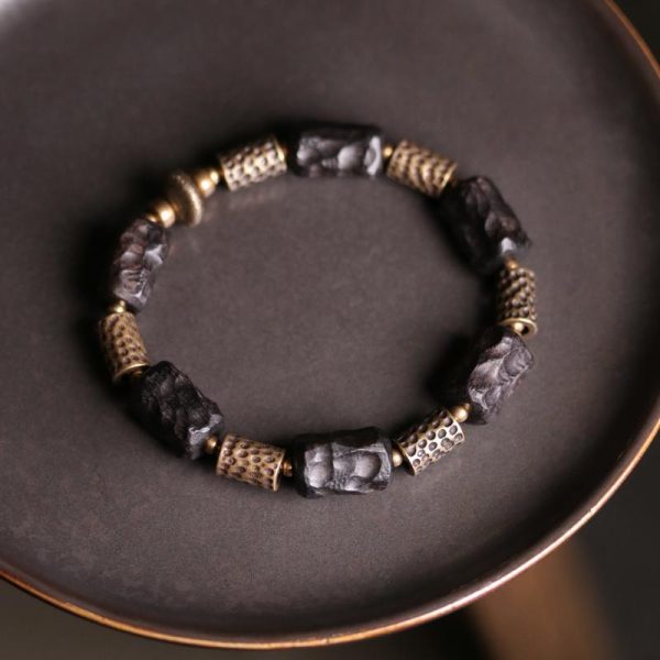 This bracelet features a unique vintage design with textured beads and intricate metal accents, creating a bold and distinctive look. The irregular bead shapes and detailed metal elements blend to offer an edgy, retro vibe, making it a standout accessory for those who love unconventional style.  Perfect for anyone seeking a statement piece that merges vintage charm with modern fashion sensibility.
