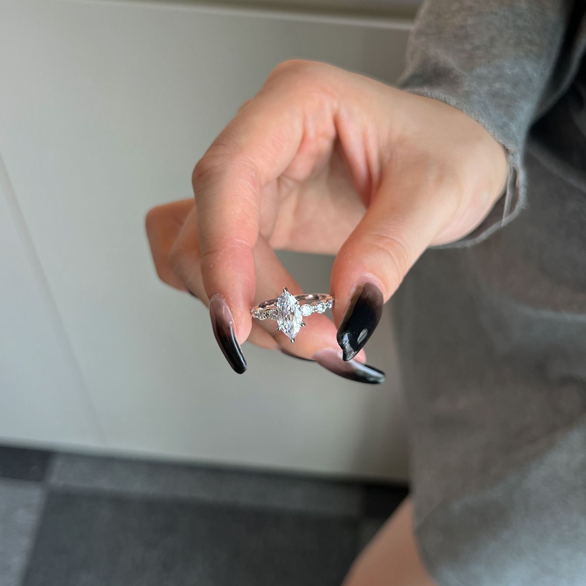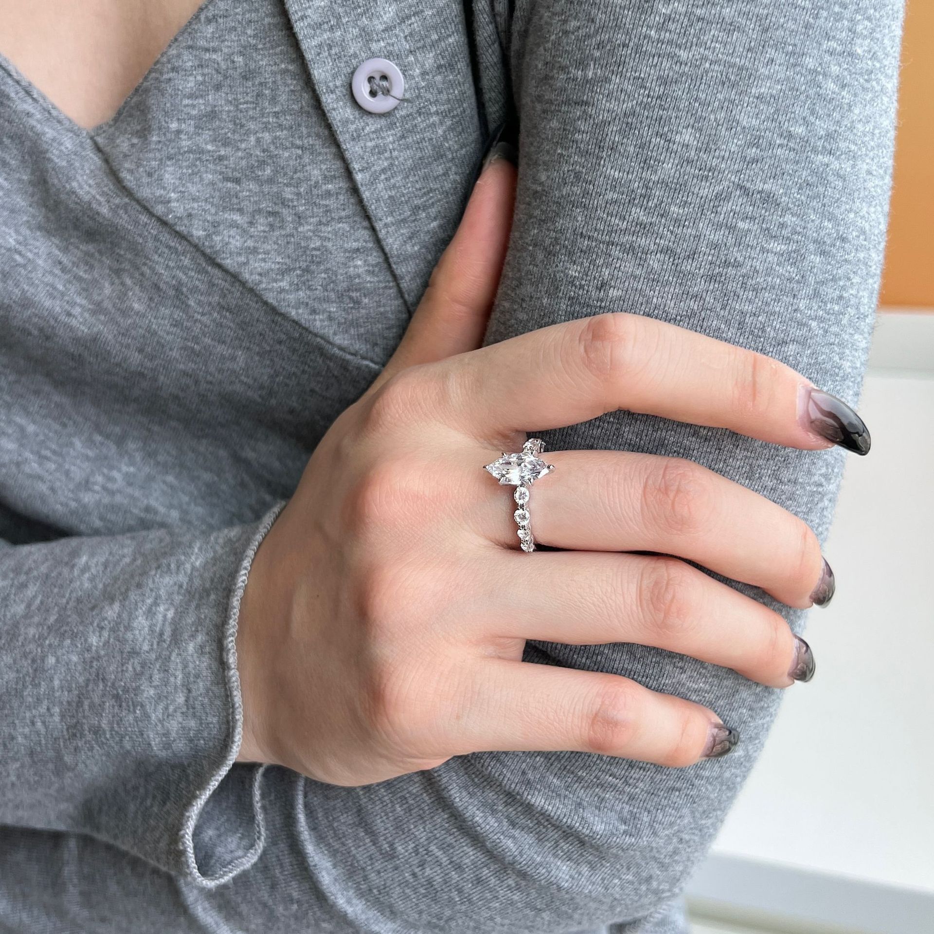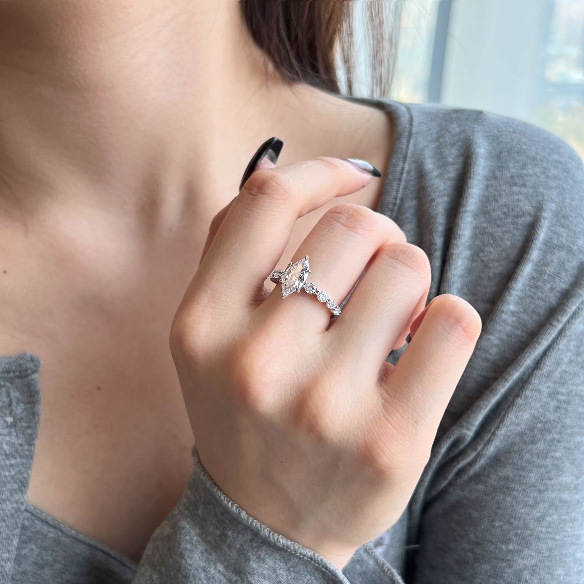 Our gorgeous  Marquise Moissanite Ring​ made with great care and exhibits classic beauty. The focal point magnificent lab produced marquise diamond, with round side and marquise diamonds that its brilliance. Moreover, with a 6 Claw Prong Setting, this ring elegant and safe to make sure every diamond sparkles beautifully.