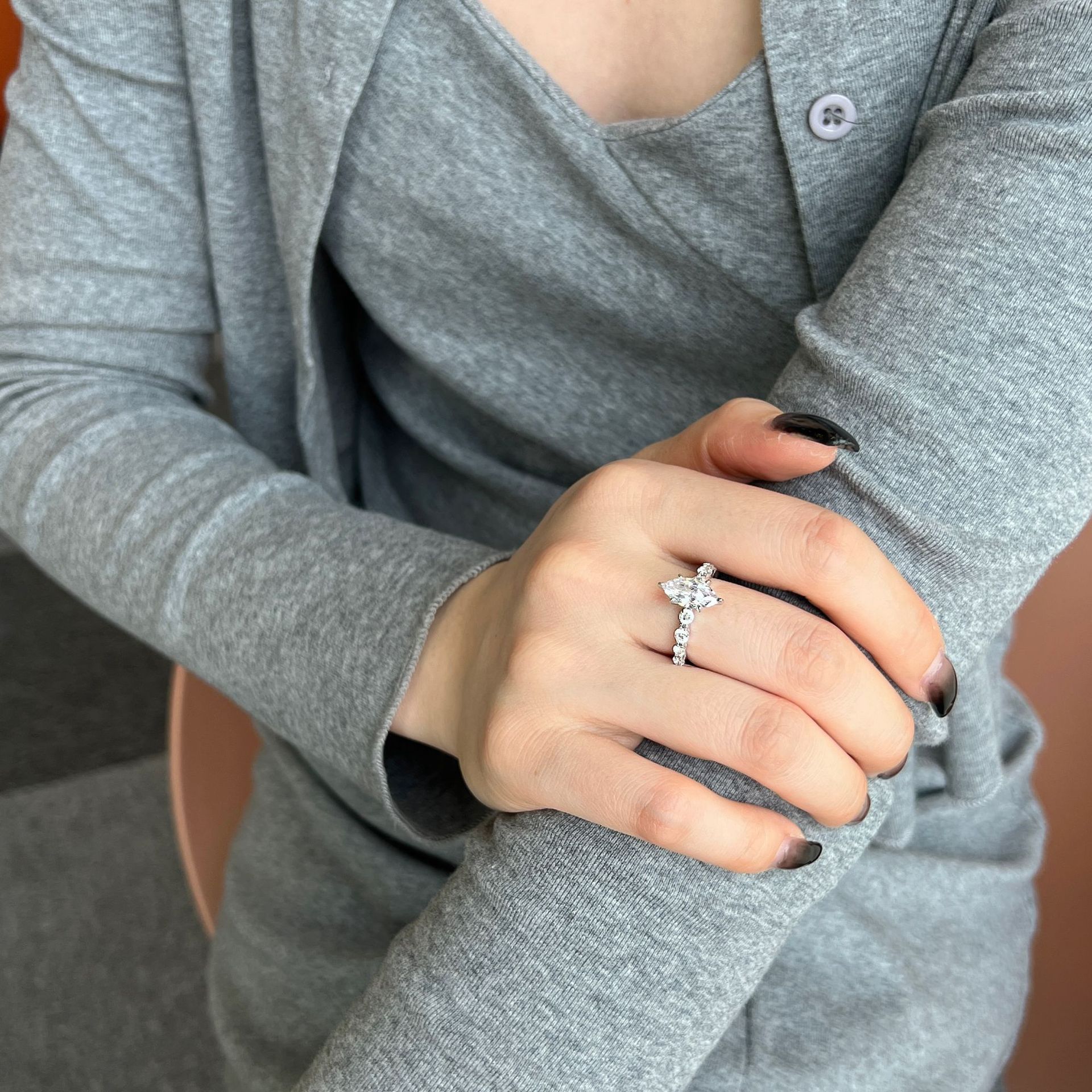 • Accented by marquise and round side diamonds, adding depth and brilliance.