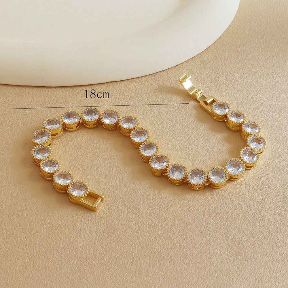 Elevate your style with this timeless round white diamond bracelet. This exquisitely crafted treasure features dazzling 18K gold-plated accents and a continuous cascade of round-cut cubic zirconia stones. Its multi-faceted design captures light at every angle, unleashing breathtaking brilliance that rivals genuine diamonds in fire and sparkle.