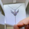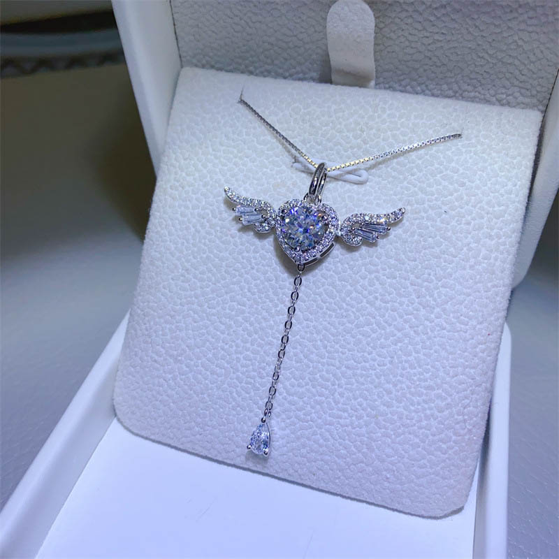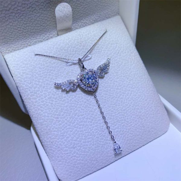 Elevate your style with the enchanting Angel Wings Heart Pendant Necklace, a symbol of eternal love and divine protection. This delicate piece features a heart-shaped centerpiece, cradled by intricately detailed angel wings that evoke a sense of heavenly grace. At its core sparkles a mesmerizing rainbow-hued moissanite stone, surrounded by a halo of brilliant-cut cubic zirconia for maximum fire and brilliance.