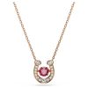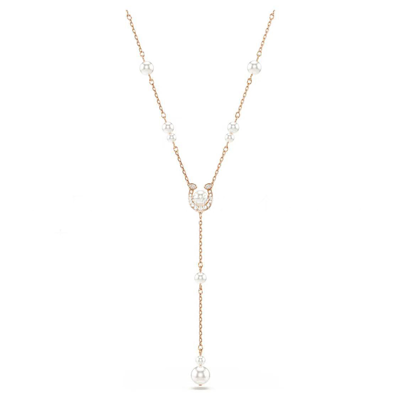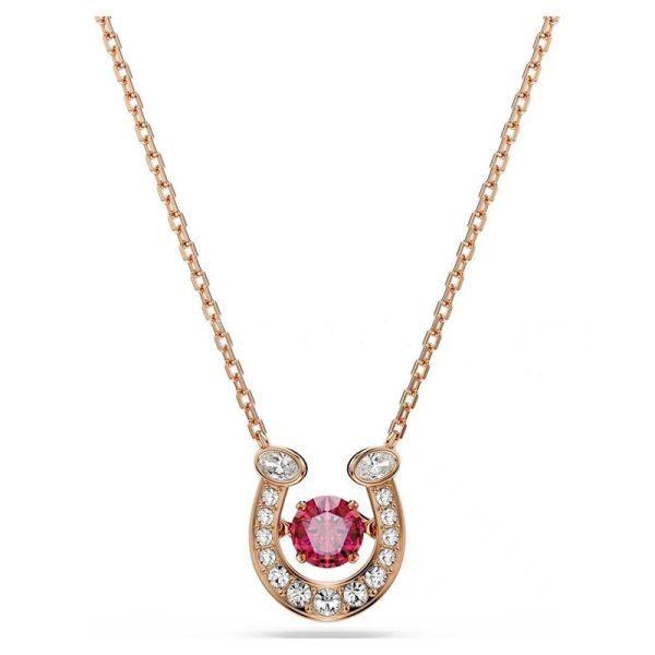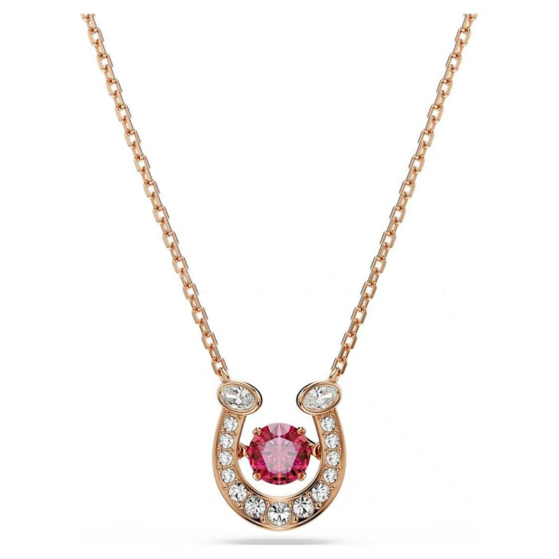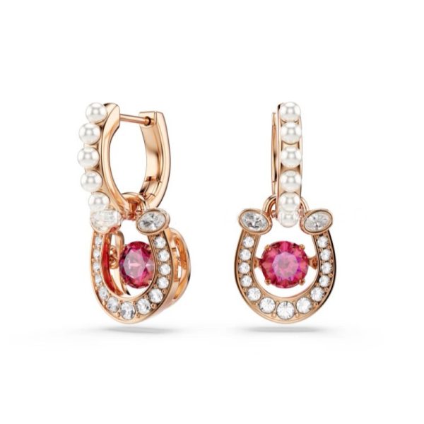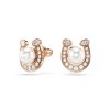 Each design is a masterclass in brilliance, featuring the iconic horseshoe motif in a polished rose-gold tone finish, meticulously outlined with dazzling pavé crystals. At its heart, a choice of either a captivating, crimson-hued stone that radiates passion or the timeless grace of a central crystal pearl.