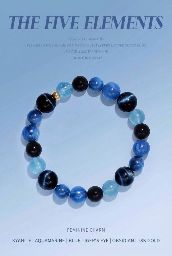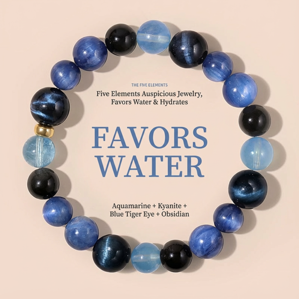 Representative crystals for Water: Aquamarine, Obsidian, Blue 晶石 (Blue 晶石 is often translated as “Blue Crystal” in this context), Silver Obsidian, Lapis Lazuli, Blue Tiger’s Eye, Black Rutilated Quartz, etc.These represent the qualities of flow and change, and are associated with wisdom and flexibility.